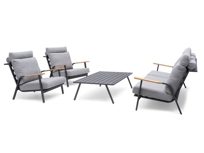 A functional and beautifully designed sofa group. Made of aluminum with wooden details in FSC®-certified teak. Color: charcoal. Grey cushions and neck pillow in olefin with quickdry foam in the seat. Quickdry is an unique foam with fast drying ability and high comfort. Quickdry is breathable, has an open cell structure and it's weather resistant. Therefore, it works optimally for outdoor furniture.