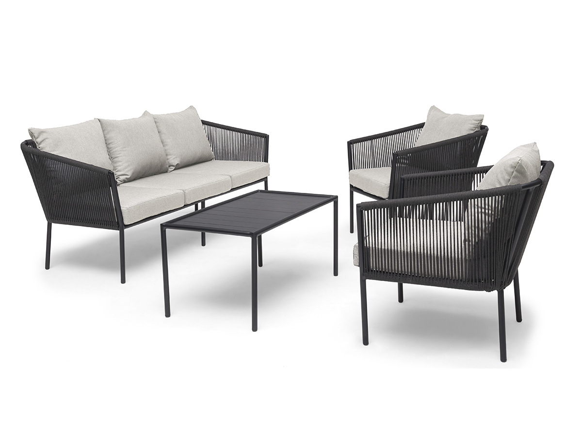 A neat, modern and sophisticated sofa group for the small patio. Made of black aluminum with braided gray ropes in olefin. Cushions with olefin fabric. Dimensions: Sofa 180x74x74 cm, Armchair 72x74x74 cm, Table 97x50x45 cm.