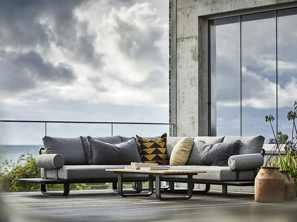 A modern furniture group for bigger parties. The sofa has practical relief surfaces in the same ribbed design as the table. Made of aluminum. Color: Charcoal. Table top in FSC-certified teak. Grey cushion in olefin with quickdry foam in the seat. Quickdry is an unique foam with fast drying ability and high comfort. Quickdry is breathable, has an open cell structure and it's weather resistant. Therefore, it works optimally for outdoor furniture. The rounded cushions in the outer edges can also be used as a pillow. Dimensions: Table 140x67x37 cm