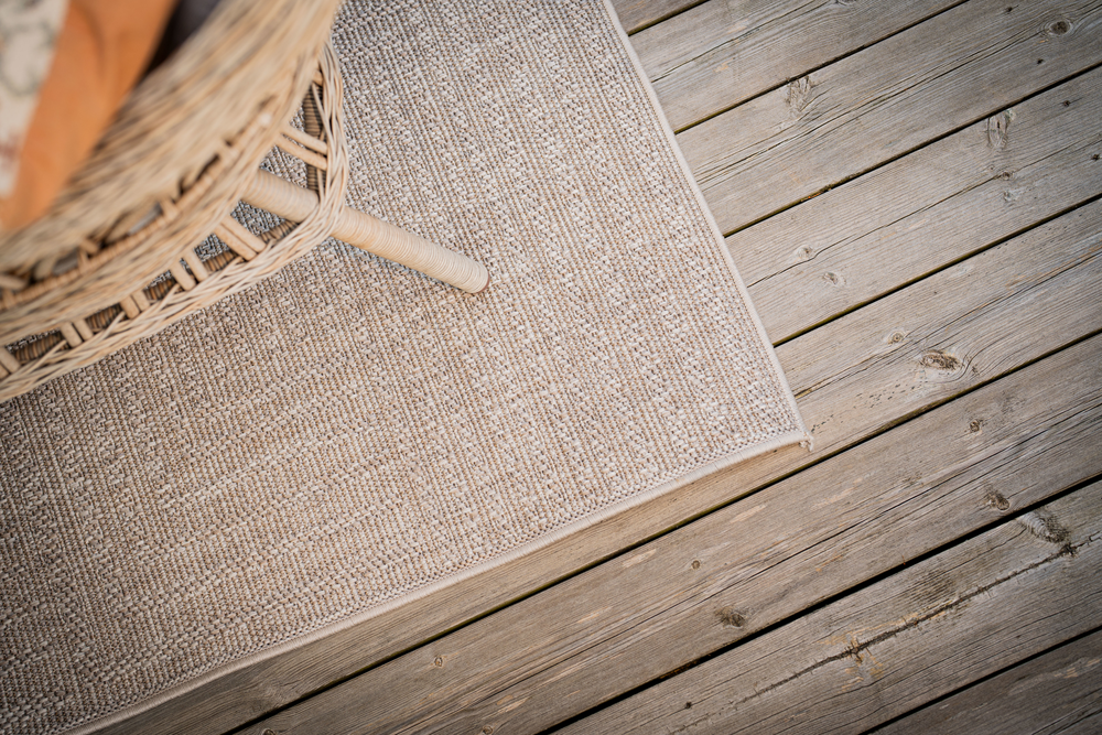 The sturdy flat weave in natural colors gives the feel of a timeless sisal look. It brings to mind outdoor spaces or conservatories, but the rug is equally beautiful indoors, placed where something extra durable is needed. The rug features clear textures, and the pattern is classically modern with a minimalist geometric design. The sense of texture is further enhanced by the interplay of yarns in different tone-on-tone shades. Made from 100% extra durable polypropylene yarn. The yarn is UV-resistant, water-resistant, won't shed, and is stain-resistant. The rug can easily be placed outdoors, in conservatories, or indoors. The edges are finished with a durable binding in a matching color. The rug is easy to clean – simply vacuum or rinse with lukewarm water and let it dry. Stains can be removed with a sponge, some lukewarm water, and dish soap.