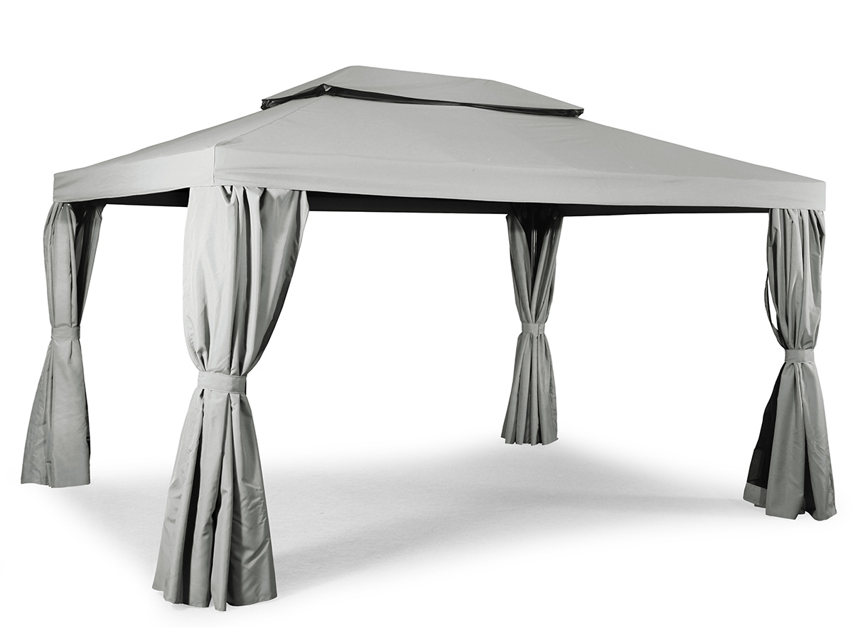 Pavilion Luxor in dark brown metal frame with roof and walls in beige polyester, fabric weight 220 grams. The pavilion is sold as a sun protector and comes complete with roofs, side walls and mosquito nets. Also included are metal bars to anchor the pavilion in the lawn. Mosquito nets and side walls can be used separately. It is good to have both mosquito nets and / or side walls on one or more sides of the pavilion while the other sides can be fully open. Two hooks in the middle of the ceiling fits well to hang lighting or other decoration in. The upper roof section (88x188 cm) allows ventilation in the pavilion and makes the air pass through easier.