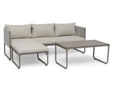 Simple and pretty lounge group for the smaller patio. A lounge group with slightly higher table than usual, which makes it both practical and funtional. Complete set with 3-seater sofa, divan, table and cushions.